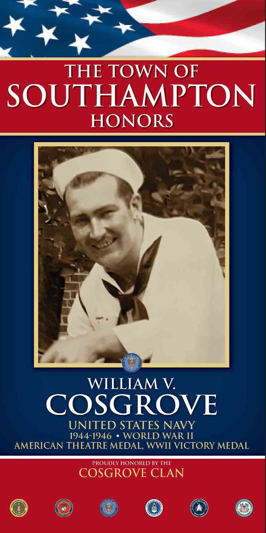 William Victor Cosgrove was born in Bronx, N.Y. on November 20, 1918. He enlisted in the Navy in 1943, refusing to let his younger brother enlist by himself. At this time he was already employed by the NYPD and took a leave to enlist. He served aboard the USS Shangri-La, (CV38), an aircraft carrier deployed in the Pacific Theatre which provided combat air patrols for its assigned task group. It also provided close air support for ground troops landing in Okinawa and participated in air attacks on Japan. After Japan’s surrender he provided policing duty in that country, using his skill as a NYPD policeman.