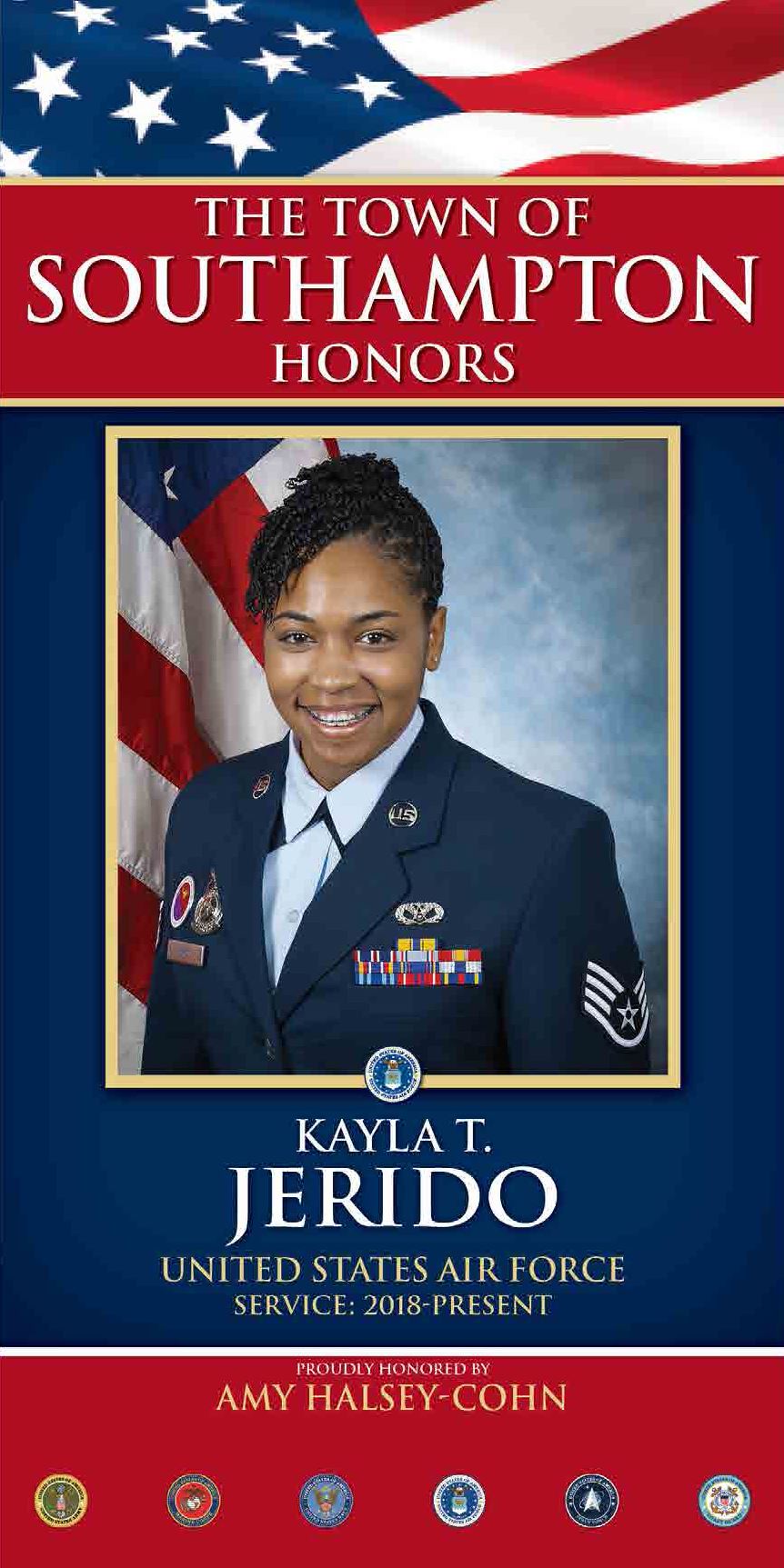 Kayla Jerido was born in Southampton, NY in 1992. After attending Shippensburg University, Kayla joined the United States Air Force in July 2018. She went to basic military training in Lackland, Air Force Base Texas, followed by Tech School in Goodfellow, Air Force Base where she completed the Fire Protection Apprentice Course.